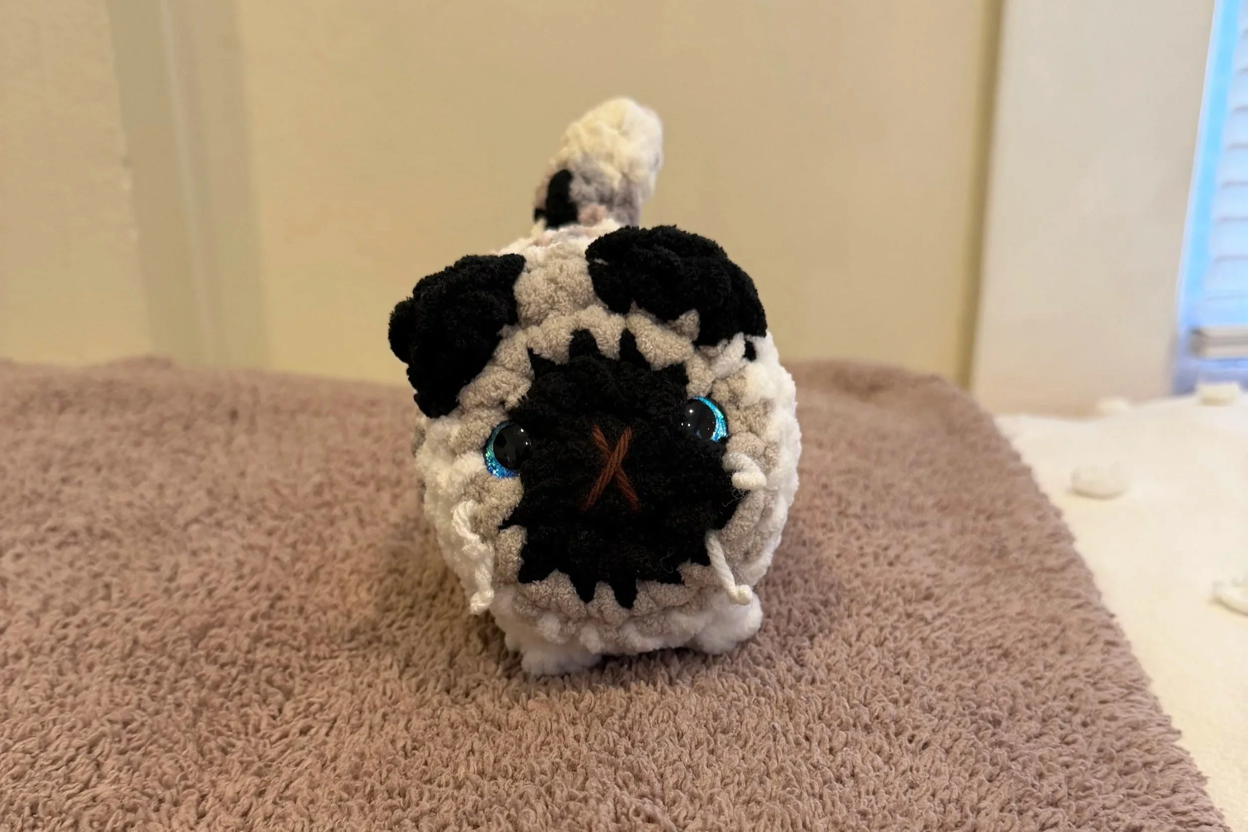 I can crochet you cat! I can make an almost exact replica or your cat! To crochet your cat you can contact me below with pictures of your cat and if you want it to be a kitten or regular sized. Next I will reply with a price range but it is usually between $24-$30. I also like to match your cats eye color so picture of eyes are amazing! Then I will reply letting you know if I can make your custom and give you a price estimate. Once all the details are finalized I will make your custom within a few weeks and ship it to you.